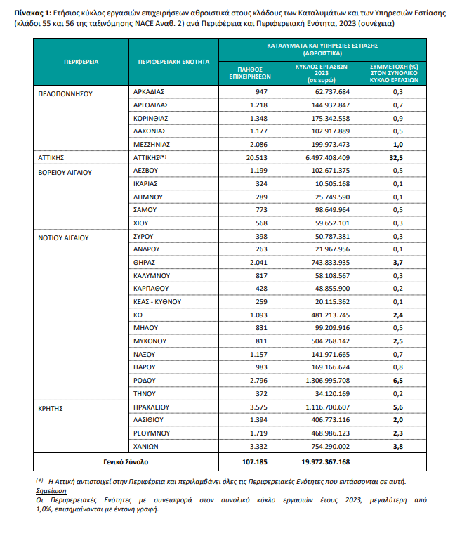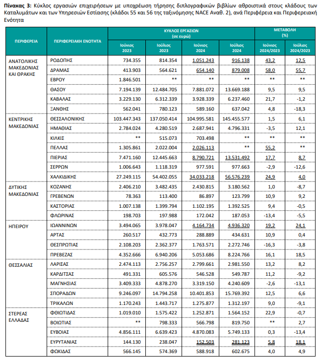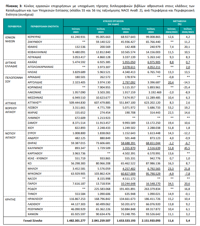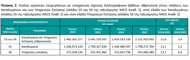 Συνολικά τον Ιούλιο του 2024, ο κύκλος των εργασιών για τις επιχειρήσεις στον κλάδο των καταλυμάτων υποχρέωση τήρησης διπλογραφικών βιβλίων ανήλθε στα 1,798 δισ. ευρώ, σημειώνοντας αύξηση 5,2% σε σχέση με τον Ιούλιο 2023, που ήταν 1,709 δισ. ευρώ.
