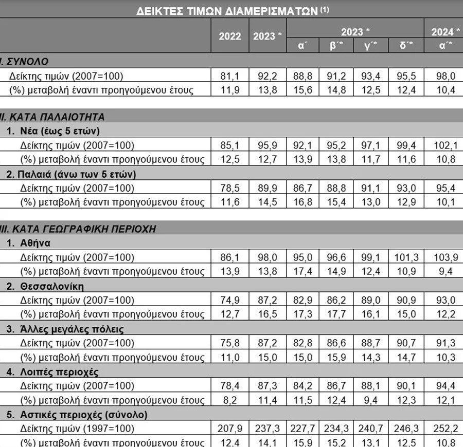 Συγκεκριμένα, το πρώτο τρίμηνο του 2024 οι τιμές των νέων διαμερισμάτων (ηλικίας έως 5 ετών) αυξήθηκαν κατά 10,8% σε σύγκριση με το αντίστοιχο τρίμηνο του 2023, ενώ οι τιμές των παλαιών διαμερισμάτων (άνω των 5 ετών) αυξήθηκαν κατά 10,1%.