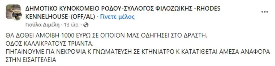 Στην ίδια ανάρτηση η κυρία Γιούλα Διμέλη ανακοίνωσε ότι θα δοθεί αμοιβή 1000 ευρώ σε όποιον δώσει πληροφορίες που θα οδηγούσουν στον δράστη που τεμάχισε και έθαψε το γατάκι.