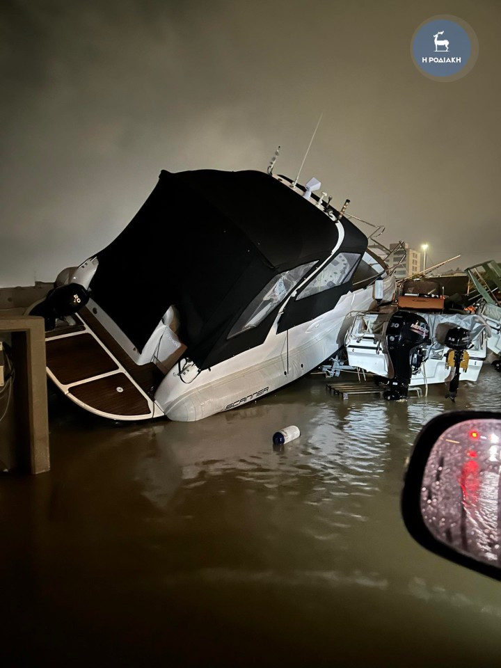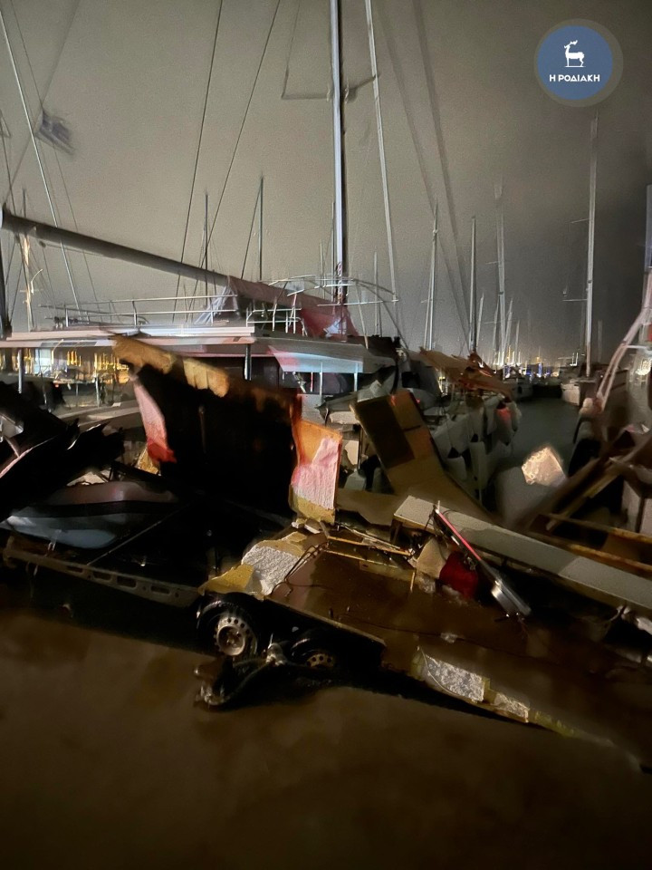 Όπως φαίνεται και στις φωτογραφίες, σκάφη αναποδογύρισαν και το ένα βρέθηκε πάνω στο άλλο προκαλώντας ζημιές.