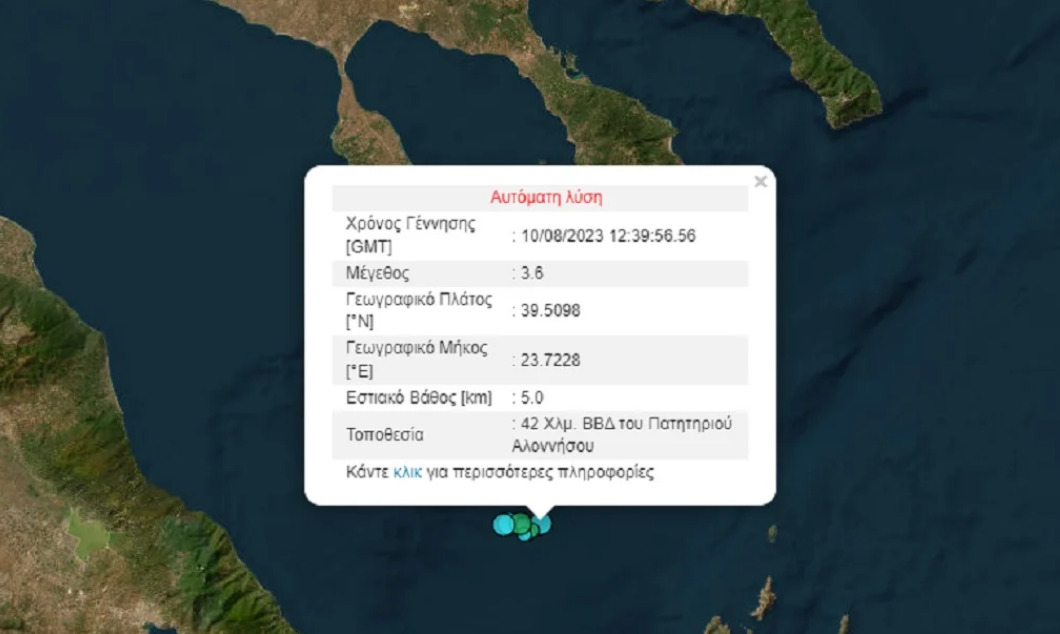 Σεισμός σημειώθηκε το μεσημέρι της Πέμπτης 10/8 ανοιχτά της Αλοννήσου.