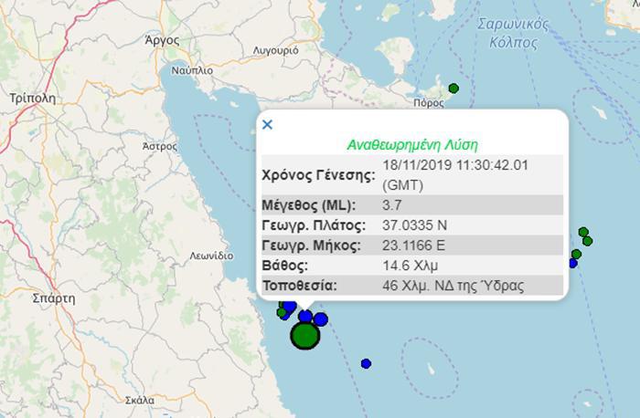Ασθενής σεισμός μεγέθους 3,7 Ρίχτερ σημειώθηκε στις 13.31 το μεσημέρι της Δευτέρας στη θαλάσσια περιοχή ανατολικά από το Πόρτο Χέλι και νοτιοδυτικά της Ύδρας και των Σπετσών.