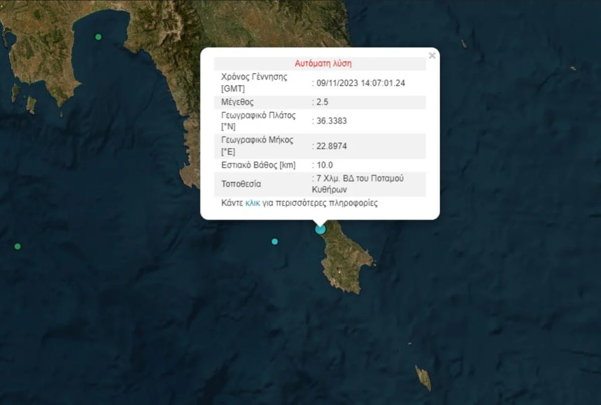 Σεισμός έγινε πριν λίγη ώρα στα Κύθηρα με την αυτόματη λύση να δείχνει πως η δόνηση ήταν 2,5 βαθμών της κλίμακας Ρίχτερ.