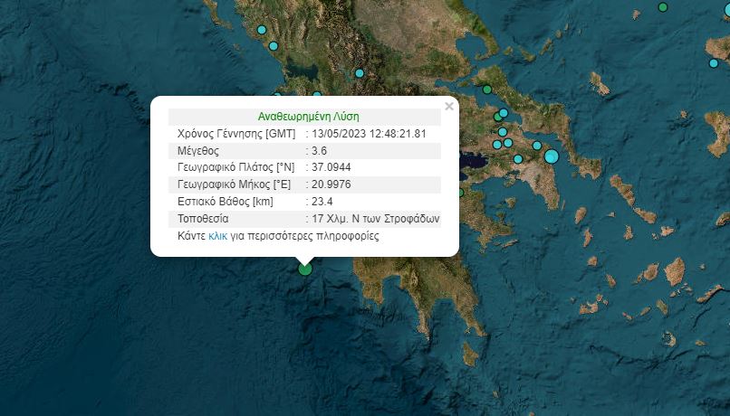 Σεισμική δόνηση μεγέθους 3,6 βαθμών της κλίμακας Ρίχτερ σημειώθηκε νωρίς το απόγευμα του Σαββάτου (13/05) στο Ιόνιο Πέλαγος.