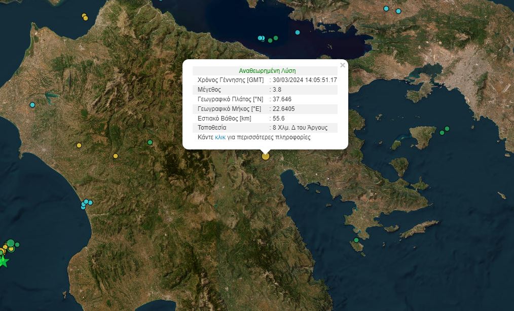 Σύμφωνα με το Γεωδυναμικό Ινστιτούτο, ο σεισμός σημειώθηκε σήμερα στις 16:05, με επίκεντρο τα 8 χλμ. δυτικά του Άργους και με εστιακό βάθος τα 55.6 χλμ.