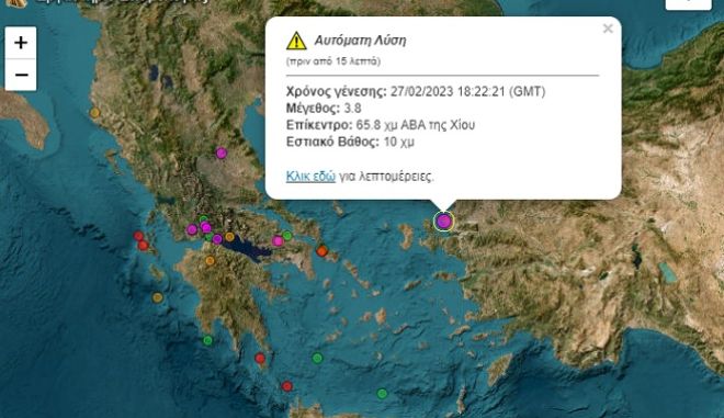 Σεισμική δόνηση μεγέθους 3,9 Ρίχτερ σημειώθηκε το απόγευμα της Καθαράς Δευτέρας (27/02) κοντά στη Χίο.