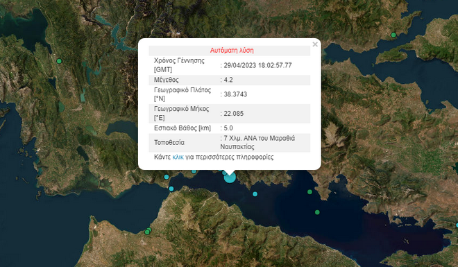 Πιο συγκεκριμένα, το Γεωδυναμικό Ινστιτούτο Αθηνών αναφέρει ότι το επίκεντρο του σεισμού εκτιμάται 7 χλμ νοτιοανατολικά του Μαραθιά Ναυπακτίας, ενώ το εστιακό βάθος υπολογίζεται στα 5 χλμ.