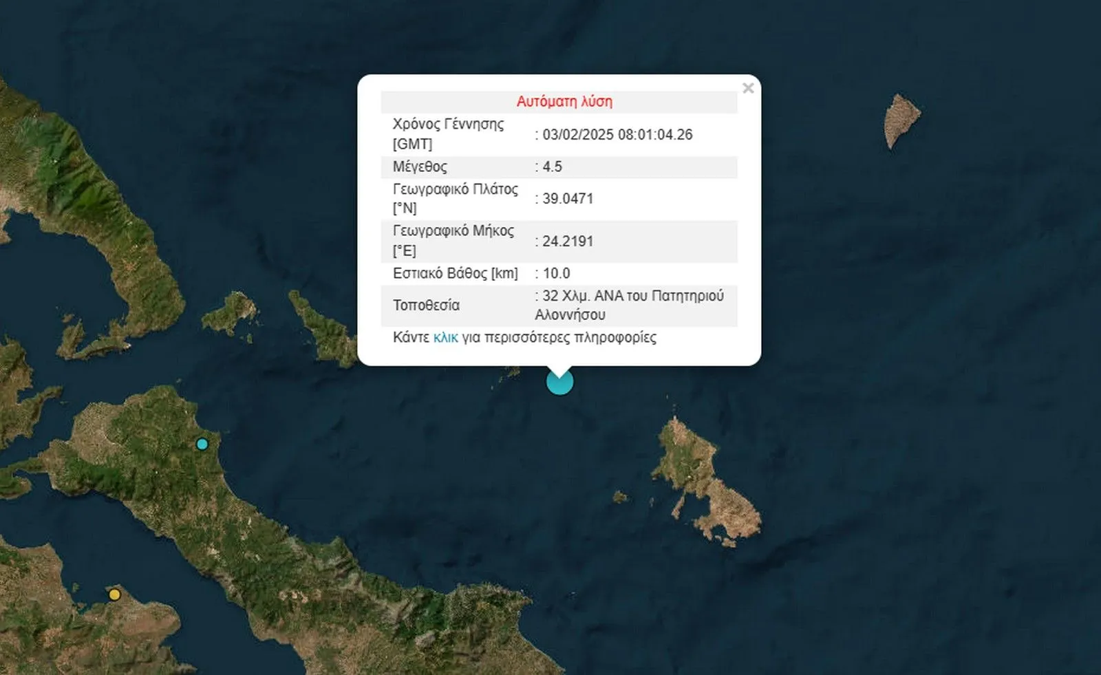 Σεισμός μεγέθους 4,5 βαθμών της κλίμακας Ρίχτερ, σημειώθηκε το πρωί της Δευτέρας (03/02) στην Αλόννησο.