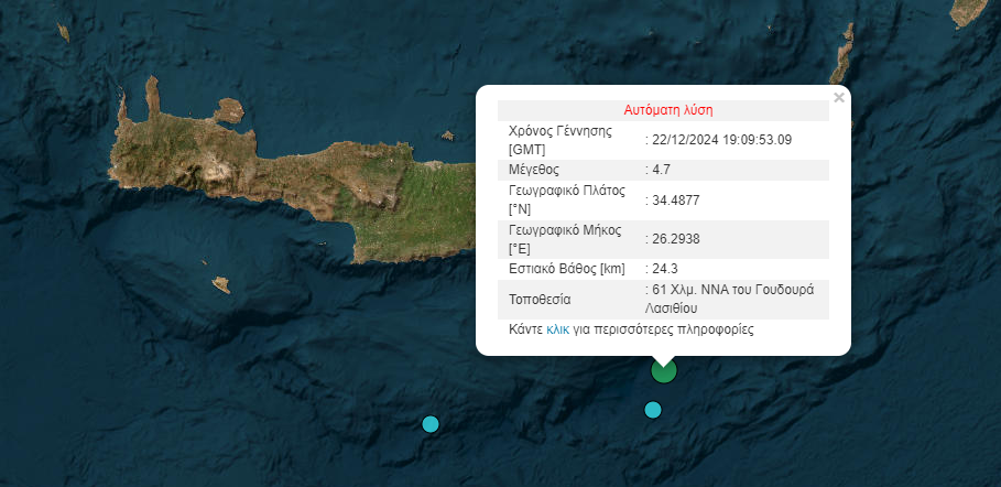 Σεισμός μεγέθους 4,7 Ρίχτερ σημειώθηκε το βράδυ της Κυριακής (22/12) στα ανοιχτά της Κρήτης.