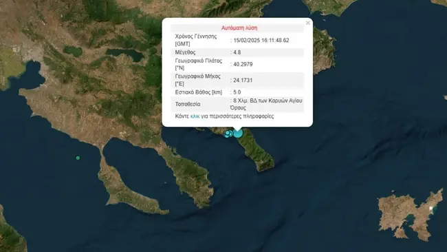 Σεισμός μεγέθους 4,8 βαθμών της κλίμακας Ρίχτερ σημειώθηκε στις 18:11, το απόγευμα του Σαββάτου (15/02) στην περιοχή του Άγιου Όρους.