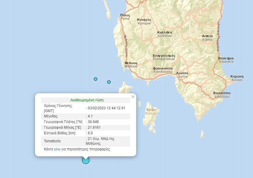 Σεισμός μεγέθους 4,1 βαθμών της κλίμακας Ρίχτερ – σύμφωνα με την αναθεωρημένη λύση του Γεωδυναμικού Ινστιτούτου του Εθνικού Αστεροσκοπείου Αθηνών – έγινε στη Μεθώνη.