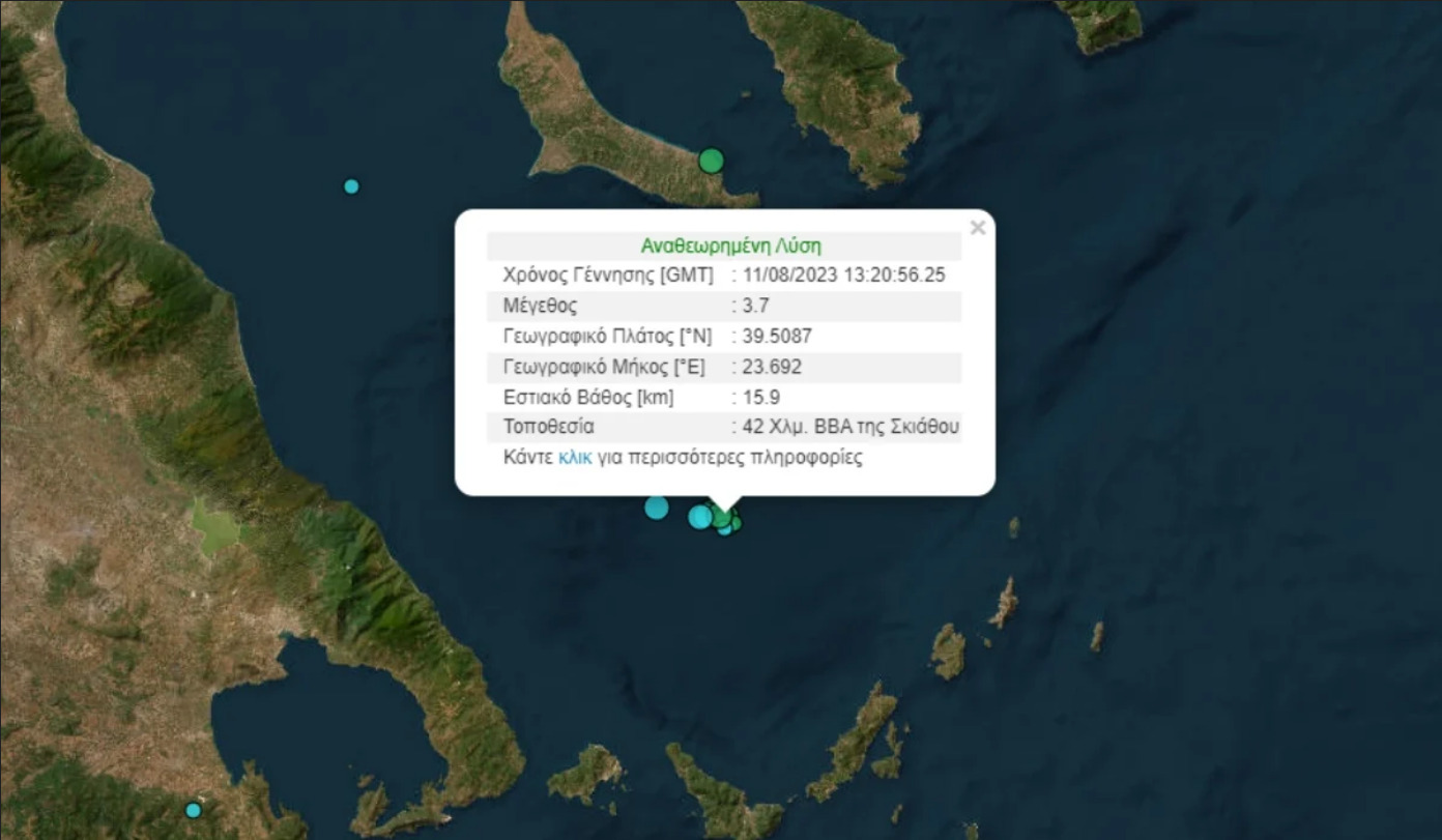 Σύμφωνα με τα πρώτα στοιχεία του Γεωδυναμικού Ινστιτούτου, η σεισμική δόνηση σημειώθηκε 42 βορειοανατολικά στης Σκιάθου