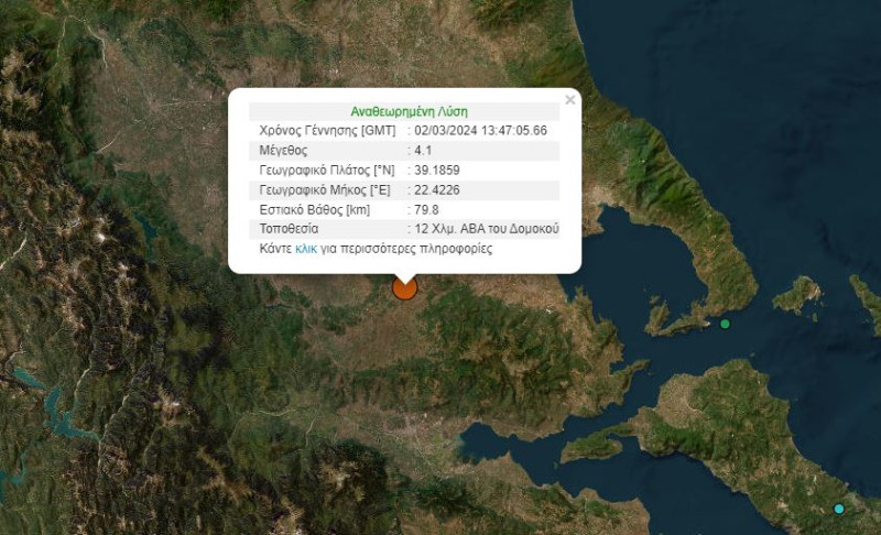 Πιο συγκεκριμένα, το επίκεντρο εντοπίστηκε στα 12 χιλιόμετρα βορειοανατολικά του Δομοκού, ενώ το εστιακό βάθος βρίσκεται στα 79,8 χιλιόμετρα.