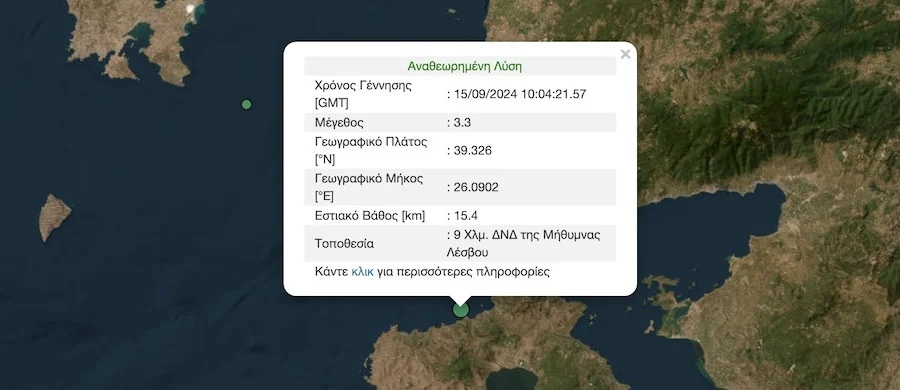 Ακόμα, το εστιακό βάθος του εν λόγω σεισμού στη Λέσβο υπολογίστηκε σε 15,4 χιλιόμετρα.