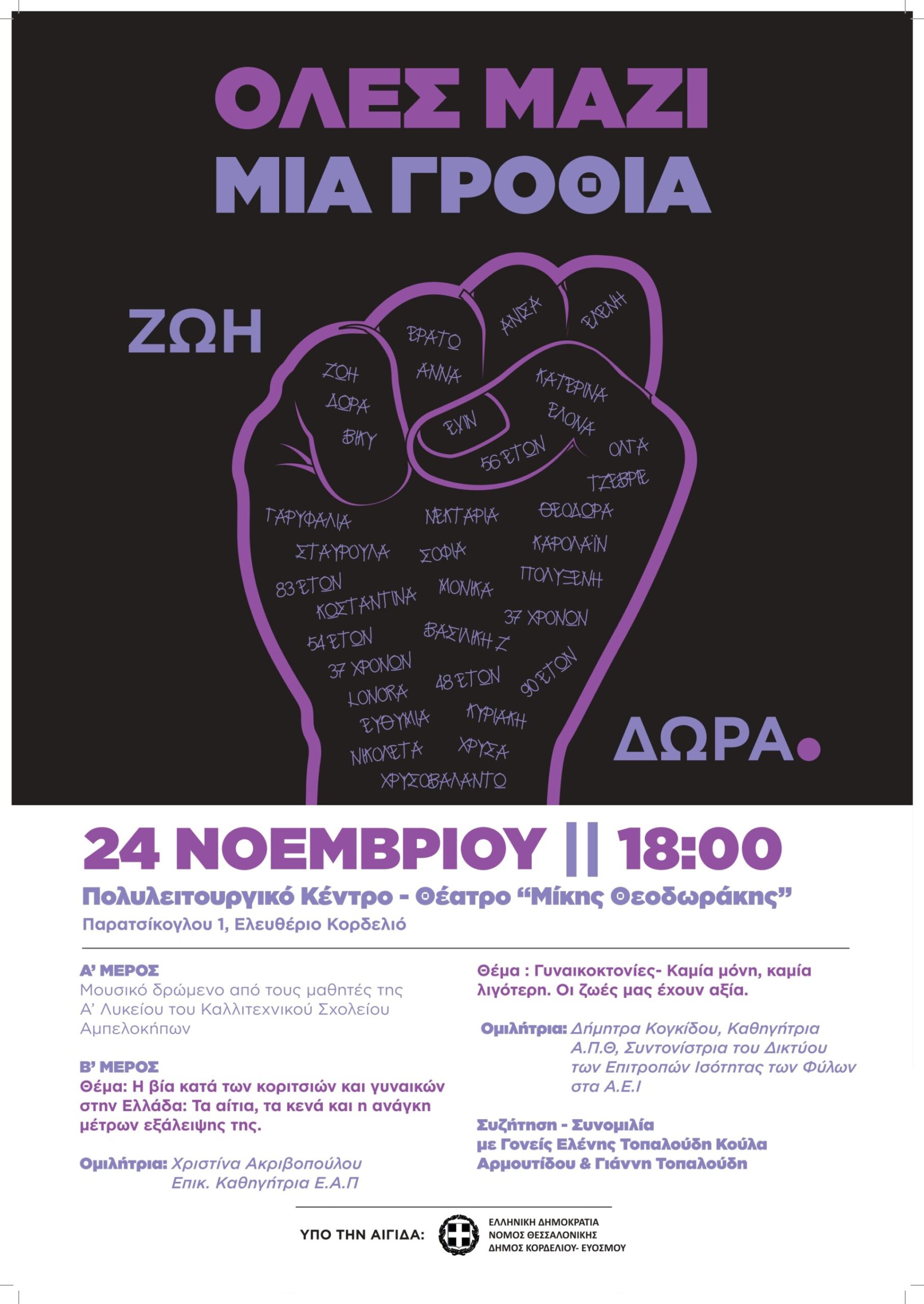 ΗΜΕΡΙΔΑ ΓΙΑ ΤΗΝ ΕΞΑΛΕΙΨΗ ΤΗΣ ΒΙΑΣ ΚΑΤΑ ΤΩΝ ΓΥΝΑΙΚΩΝ «ΟΛΕΣ ΜΑΖΙ ΜΙΑ ΓΡΟΘΙΑ» από τον Δήμο Κορδελιού – Ευόσμου