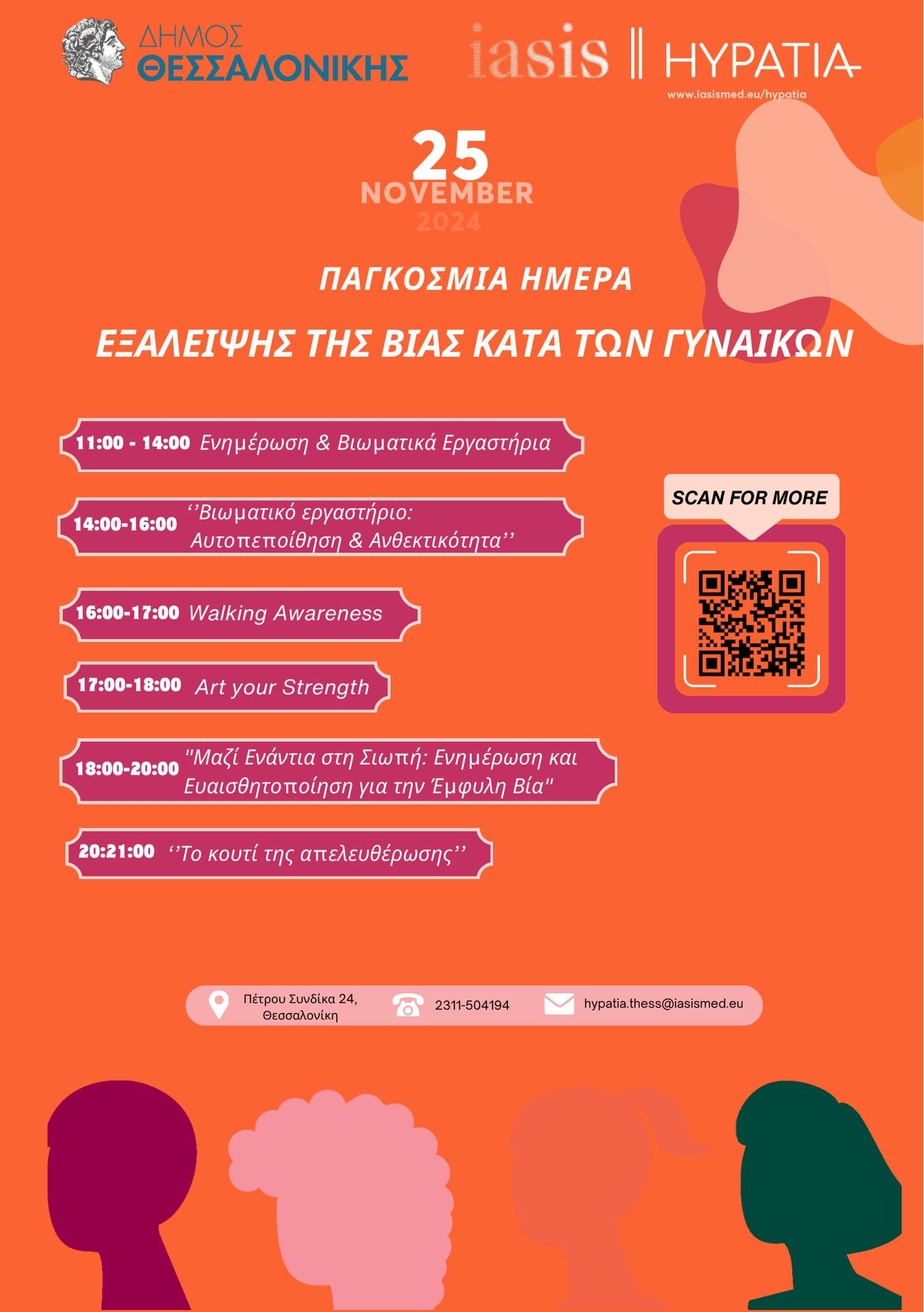 - 18:00 – 20:00 “Μαζί Ενάντια στη Σιωπή”: Ενημέρωση και ευαισθητοποίηση για την έμφυλη βία. Συζητάμε τους τρόπους αντιμετώπισης και εξετάζουμε το νομοθετικό πλαίσιο. Μια σημαντική δράση για την ενδυνάμωση και την αλλαγή!
