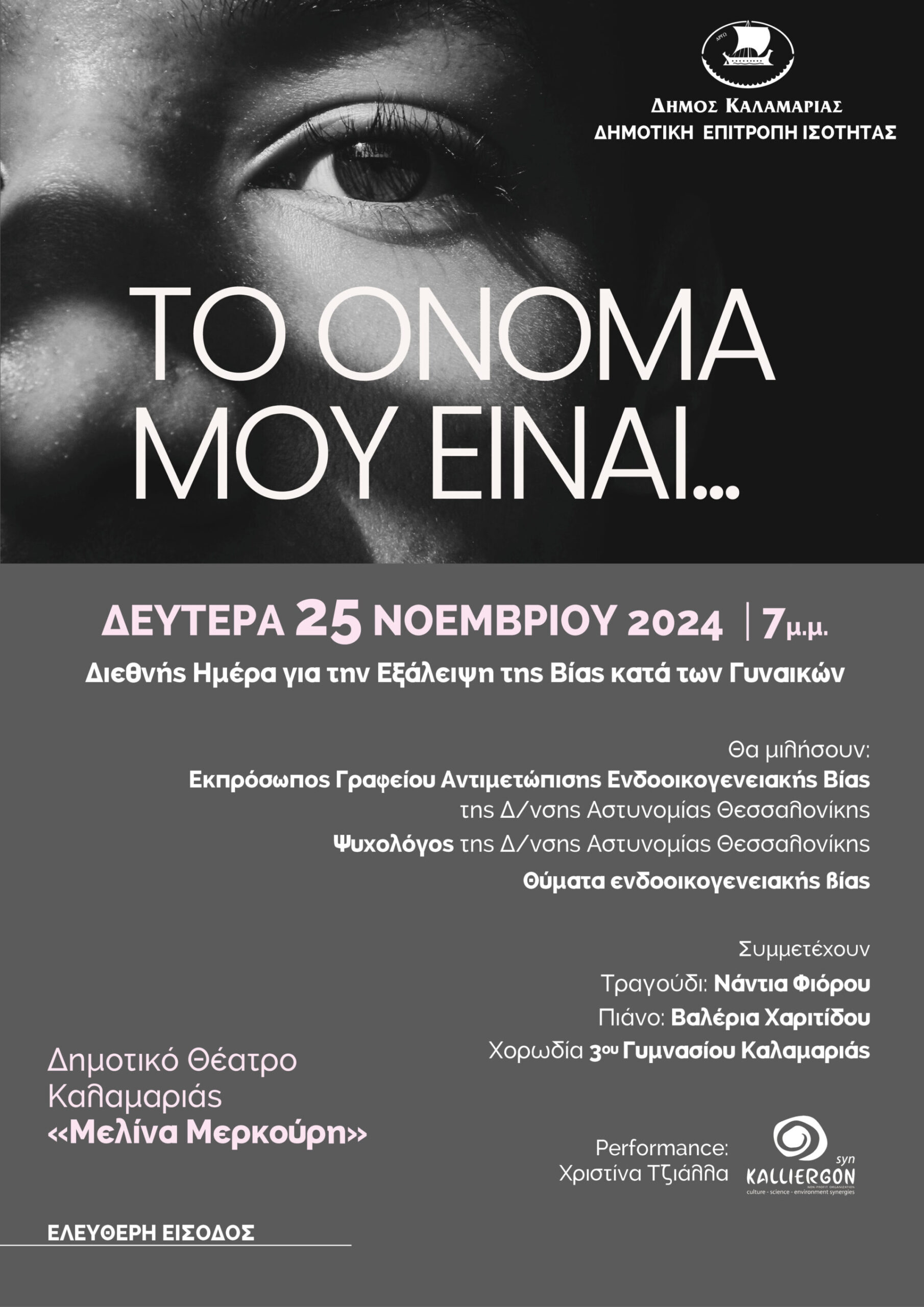 Ο Δήμος Καλαμαριάς και η Δημοτική Επιτροπή Ισότητας ενώνουν τη φωνή τους με εκατομμύρια φωνές σε κάθε γωνιά του κόσμου και συμμετέχουν με μια ξεχωριστή εκδήλωση υπό τον τίτλο «Το όνομά μου είναι…» στην Διεθνή Ημέρα για την Εξάλειψη της Βίας κατά των Γυναικών.