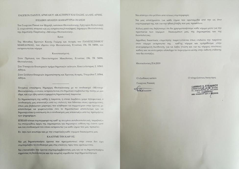 Επιδώσαμε σήμερα, Μεγάλη Πέμπτη 25/04/2019, μέσω δικαστικού επιμελητή εξώδικο στην Μονάδα Έρευνας Κοινής Γνώμης και Αγοράς, καθώς μετά από καταγγελία ψηφοφόρου μας διαπιστώσαμε ότι η εν λόγω μονάδα, διενεργεί δημοσκόπηση για τον Δήμο Θεσσαλονίκης, στην οποία περιλαμβάνει όλες τις υποψηφιότητες, εκτός από την δική μας, του Γιώργου Ρακκά, από το Μένουμε Θεσσαλονίκη.