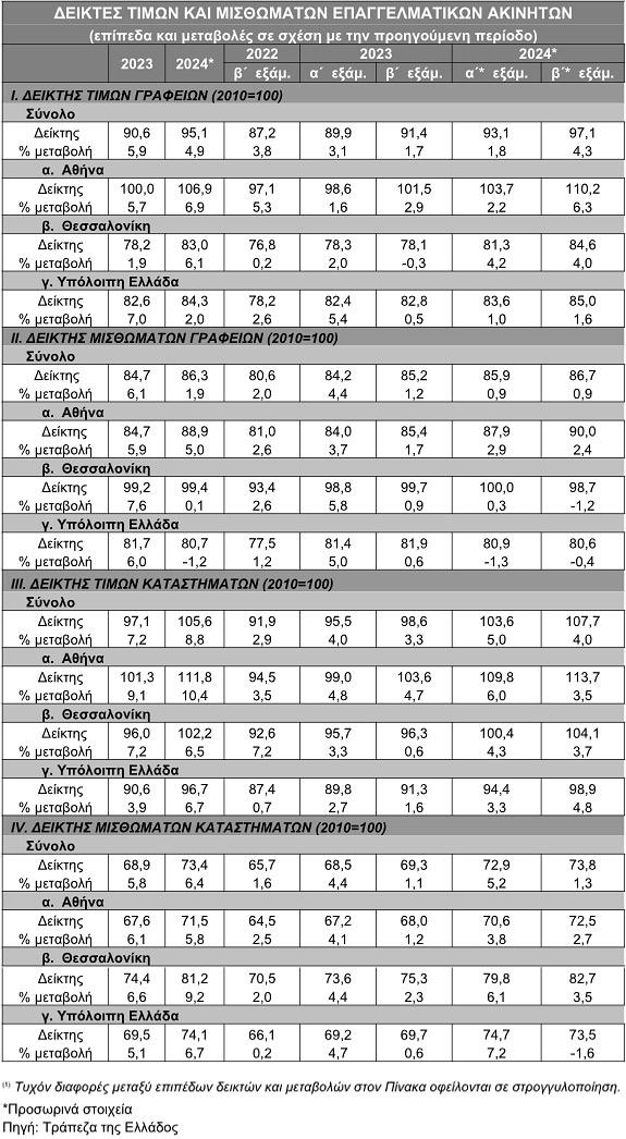 Για το σύνολο του 2024, τα μισθώματα γραφείων όλων των κατηγοριών σε ονομαστικούς όρους, για το σύνολο της χώρας, αυξήθηκαν κατά 1,9%. Με διάκριση κατά γεωγραφική περιοχή, ο ρυθμός μεταβολής των μισθωμάτων γραφείων για την Αθήνα ανήλθε σε 5,0%, για τη Θεσσαλονίκη σε 0,1% και για την υπόλοιπη Ελλάδα σε -1,2%.