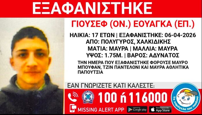 Συναγερμός έχει σημάνει στις αρχές για την εξαφάνιση του 17χρονου Εουάντα (επ.) Γιουσέφ (ον.), αιγυπτιακής καταγωγής, τα ίχνη του οποίου χάθηκαν το πρωί της Μ. Δευτέρας (6/4) από χώρο φιλοξενίας ασυνόδευτων ανηλίκων στην περιοχή του Πολύγυρου, Χαλκιδικής.