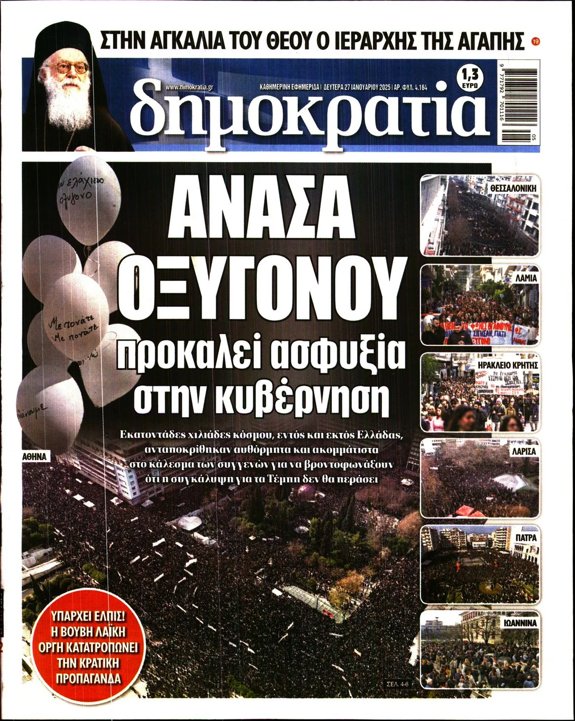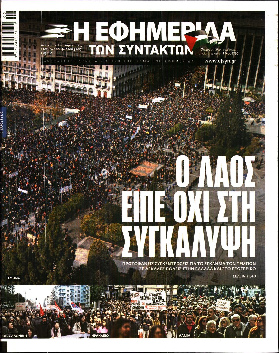 Σήμερα, Δευτέρα 27 Ιανουαρίου, μια ημέρα μετά, ο ελληνικός Τύπος συμπεριέλαβε τις μεγαλειώδεις διαδηλώσεις στα πρωτοσέλιδά του. Κάποια εξώφυλλα αφιέρωσαν ολόκληρη τη σελίδα τους στους εκατοντάδες χιλιάδες πολίτες που στήριξαν με την παρουσία τους, σε διάφορα σημεία του κόσμου, τους συγγενείς των θυμάτων. Άλλα ειδησεογραφικά μέσα προσπέρασαν τη χθεσινή ημέρα μάλλον, σαν να ήταν μια μαζική Κυριακάτικη βόλτα, και έτσι δεν υπάρχει καμία αναφορά στις συγκεντρώσεις.