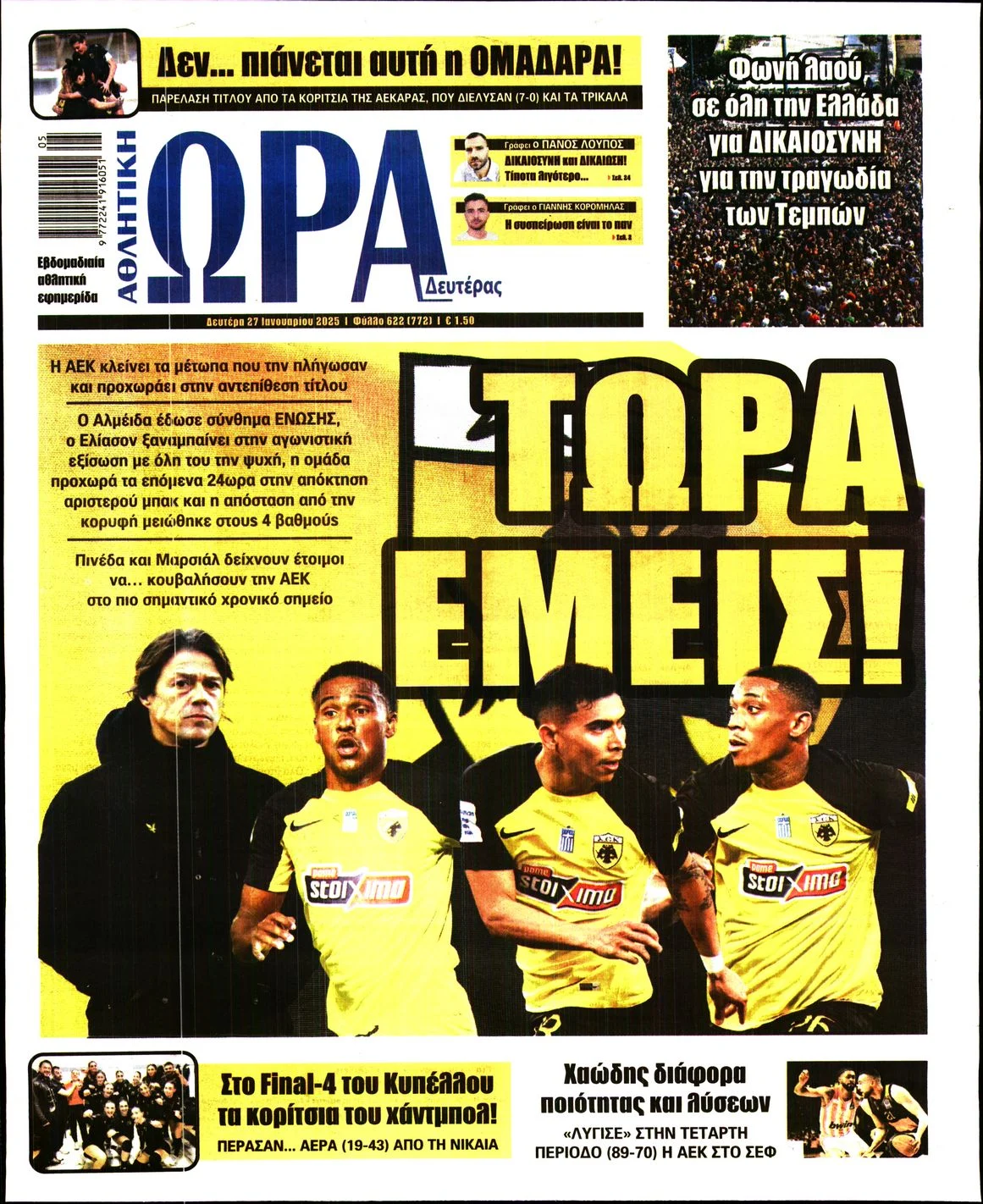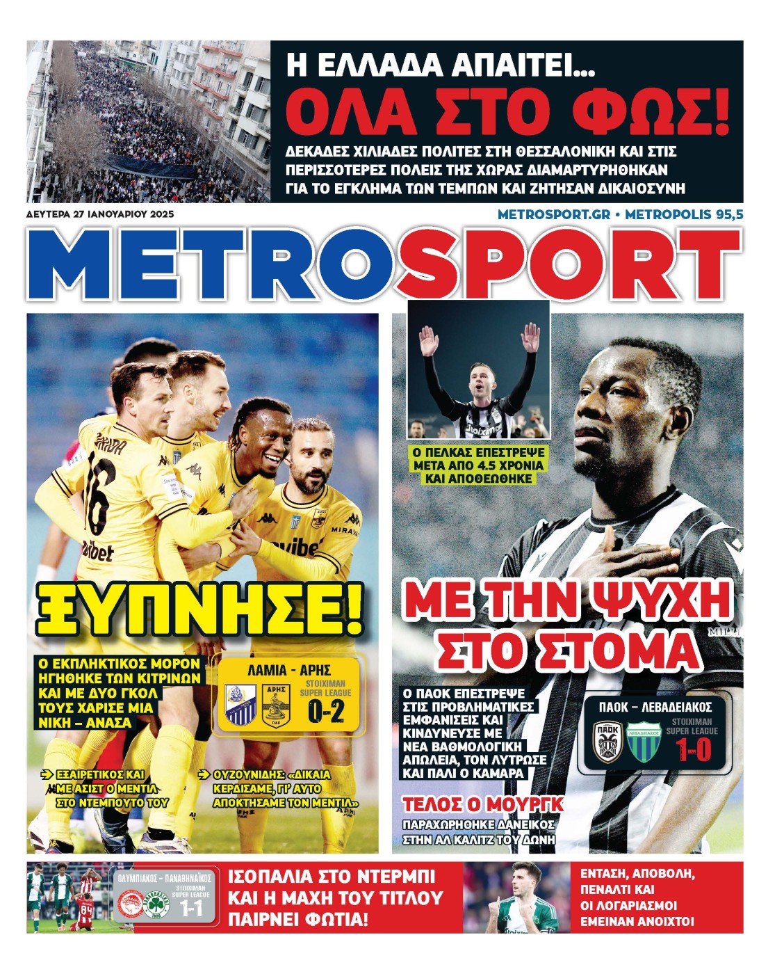 Μάλιστα ορισμένες αθλητικές εφημερίδες, αφιέρωσαν επίσης χώρο για τις κινητοποιήσεις για το έγκλημα των Τεμπών, στα εξώφυλλά τους: