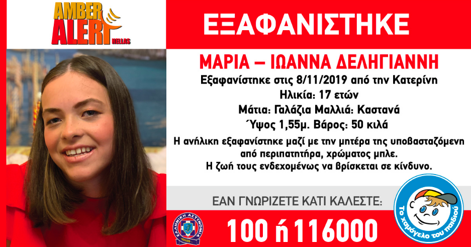 Για την ανήλικη, το “Χαμόγελο του Παιδιού” ενεργοποίησε, κατόπιν συναίνεσης της αστυνομίας, συναγερμό “Ambert Alert”. Όπως αναφέρει η ανακοίνωση, πρόκειται για την Μαρία – Ιωάννα Δεληγιάννη, η οποία έχει ύψος 1.55 μ., ζυγίζει 50 κιλά, έχει καστανά μαλλιά και γαλάζια μάτια. Η ανήλικη αντιμετωπίζει κινητικά προβλήματα και γι’ αυτό χρησιμοποιεί περιπατητήρα, χρώματος μπλε, όπως περιγράφεται στην ανακοίνωση-ειδοποίηση.