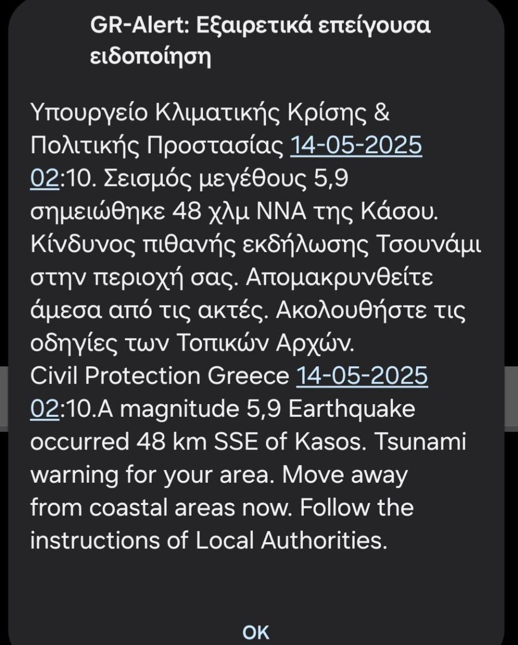 Μεταμεσονύχτια αναστάτωση από τον ισχυρό σεισμό 6 βαθμών της κλίμακας Ρίχτερ ανοιχτά της Κάσου. Μήνυμα από το 112 για κίνδυνο εκδήλωσης τσουνάμι. Καθησυχαστικός ο Ευθύμιος Λέκκας.