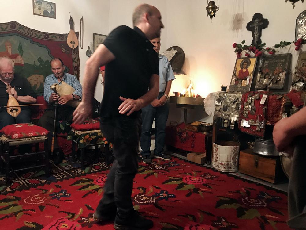 Πριν από το βάδισμα με γυμνά πόδια πάνω σε ένα στρώμα πυρακτωμένων κάρβουνων, χθες έγινε μια ιδιαίτερη προσευχή στον κλειστό χώρο, το κονάκι, όπου η ατμόσφαιρα ήταν φορτωμένη με ιδιαίτερη χαρά, φορτισμένη με πνευματικά χαρακτηριστικά. Συνόδευαν το τελετουργικό οι τρεις μουσικοί με θρακιώτικη λύρα, γκάιντα και νταούλι.