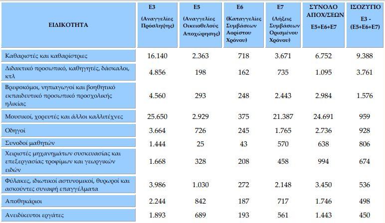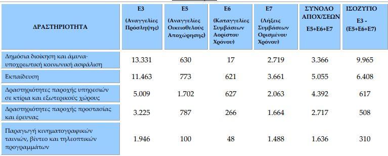 Από τις 215.874 συνολικά αποχωρήσεις, οι 87.544 προήλθαν από οικειοθελείς αποχωρήσεις και οι 128.330 από καταγγελίες συμβάσεων αορίστου χρόνου ή λήξεις συμβάσεων ορισμένου χρόνου.