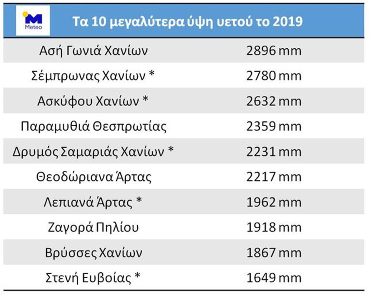 Ως προς τις βροχοπτώσεις που εκδηλώθηκαν στη χώρα το 2019, αξίζει να σημειωθεί ότι σε αντίθεση με τις περισσότερες χρονιές, τα μεγαλύτερα ετήσια ύψη βροχόπτωσης εντοπίζονται στην Κρήτη, ενώ και η πόλη της Αθήνας βίωσε μια από τις πιο υετοφόρες χρονιές των τελευταίων 15 ετών. Υπενθυμίζουμε ότι το Φεβρουάριο του 2019 η Κρήτη επηρεάστηκε από δύο ισχυρότατες κακοκαιρίες, τη Χιόνη και την Ωκεανίδα, με περισσότερα από 1.100 χιλιοστά βροχής να καταγράφονται για ολόκληρο τον μήνα σε Ασκύφου και Ασή Γωνιά Χανίων.