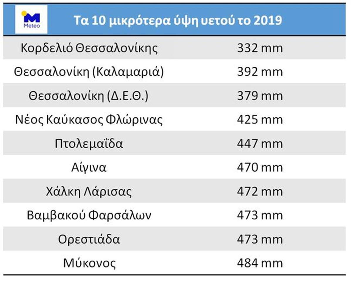 Αντίθετα, τα μικρότερα ετήσια ύψη βροχόπτωσης εντοπίζονται στη Βόρεια Ελλάδα όπου η χρονιά ήταν ιδιαίτερα ξηρή, με την ετήσια βροχόπτωση στην πόλη της Θεσσαλονίκης να υστερεί ακόμα και σε σχέση με τις Κυκλάδες. Στους παρακάτω πίνακες παρουσιάζονται τα 10 μεγαλύτερα και τα 10 μικρότερα ετήσια ύψη βροχόπτωσης για το 2019. Με αστερίσκο επισημαίνονται σταθμοί στους οποίους έχει διαπιστωθεί έλλειψη δεδομένων βροχόπτωσης και ως εκ τούτου οι καταγραφές υστερούν των πραγματικών.