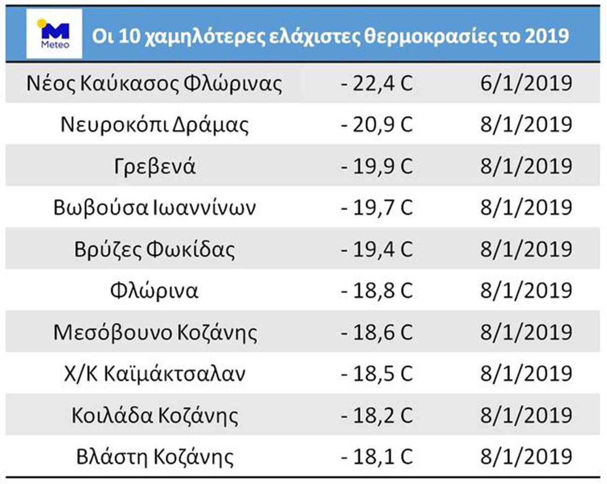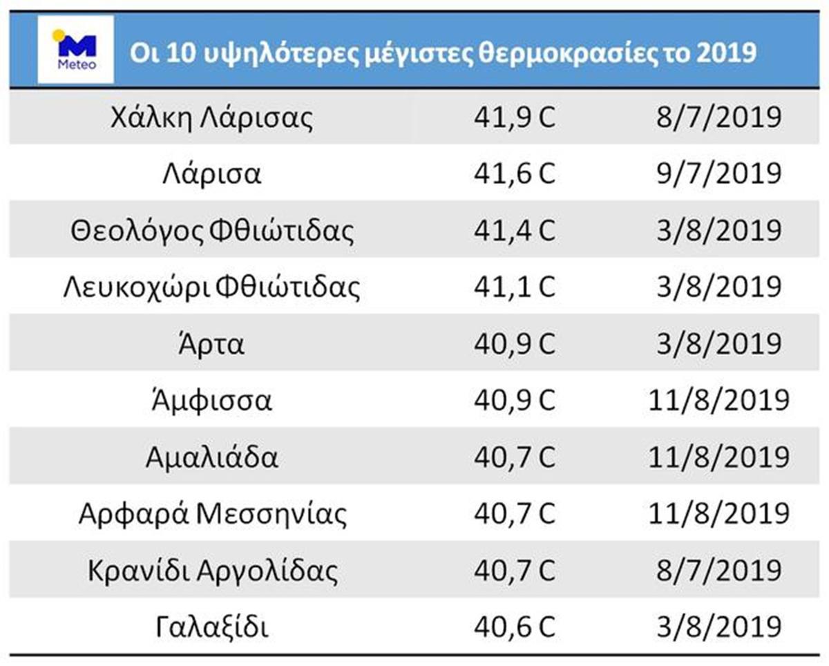 Οι υψηλότερες θερμοκρασίες του έτους σημειώθηκαν κατά τη διάρκεια των 3 έντονων κυμάτων ζέστης που έπληξαν τη χώρα, στις 7-10 Ιουλίου, στις 3 Αυγούστου και στις 10-12 Αυγούστου. κα στη χώρα το 2019. Οι χαμηλότερες θερμοκρασίες του έτους καταγράφηκαν κατά τη διάρκεια των κακοκαιριών Σοφία και Τηλέμαχος την περίοδο 3-8 Ιανουαρίου. Στους παρακάτω πίνακες παρουσιάζονται τα 10 υψηλότερες μέγιστες και οι 10 χαμηλότερες ελάχιστες θερμοκρασίες για το 2019.