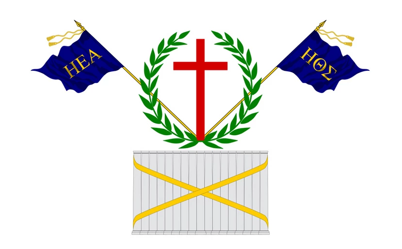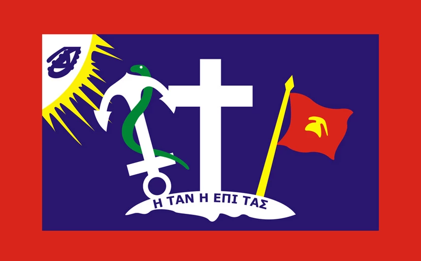 Αριστερά, υπάρχει μια λόγχη με ένα λάβαρο που απεικονίζει μια περικεφαλαία, για να υπενθυμίσει τους ένδοξους αγώνες των αρχαίων Ελλήνων και κάτω γράφει Η’ ΤΑΝ Η΄ΕΠΙ ΤΑΣ, την φράση που έλεγαν οι γυναίκες της Σπάρτης στους άνδρες πριν φύγουν για τη μάχη/