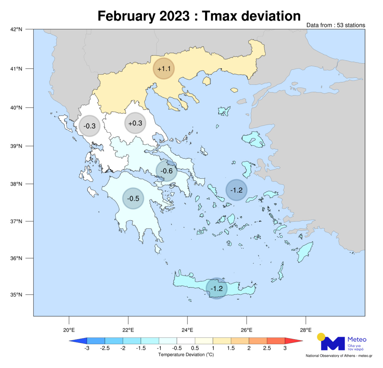 Ο χάρτης δείχνει τις αποκλίσεις της μέσης μέγιστης θερμοκρασίας τον Φεβρουάριο 2023 ανά γεωγραφικό διαμέρισμα.