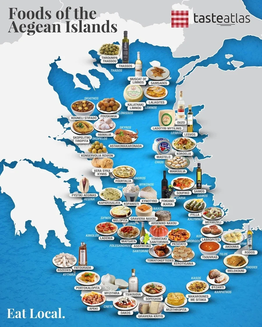 Αυτή τη φορά, το Taste Atlas ξεχώρισε τα νησιά του Αιγαίου που φημίζονται για ένα συγκεκριμένο συστατικό, ποτό ή πιάτο τους και τα έβαλε στο γευστικό του χάρτη.