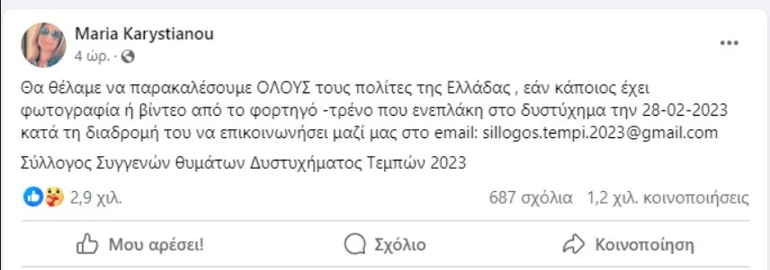 Σε ανάρτησή της στα social media, η κ. Καρυστιανού απηύθυνε κάλεσμα στους πολίτες να συνδράμουν με βίντεο και φωτογραφίες από την εμπορική αμαξοστοιχία, ώστε να παραδοθεί στον σύλλογο οπτικοακουστικό υλικό.