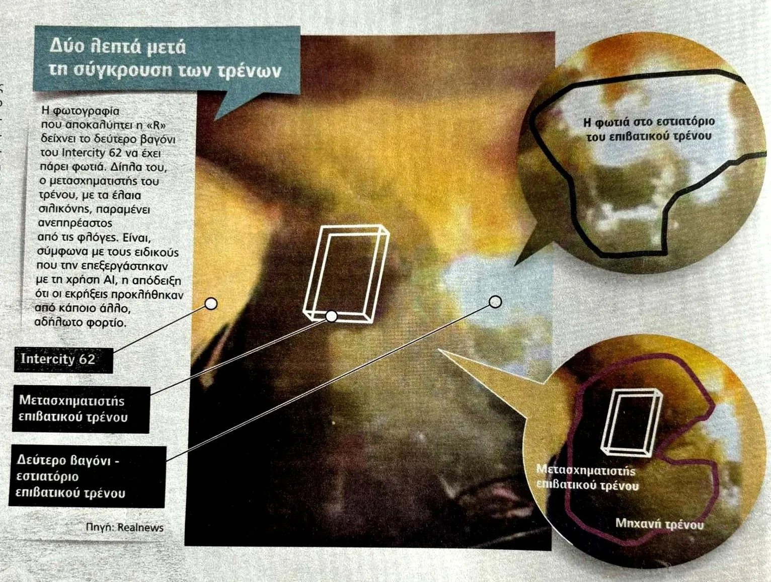 Η εικόνα αυτή, σύμφωνα με τους ειδικούς που την επεξεργάστηκαν με τη χρήση AI, είναι αδιάψευστος μάρτυρας ότι οι εκρήξεις που ακολούθησαν τη σύγκρουση των τρένων προκλήθηκα όχι από τα έλαια σιλικόνης, αλλά από κάποιο άλλο εύφλεκτο φορτίο, το οποίο δεν είχε ποτέ δηλωθεί. Η φωτογραφία, τραβηγμένη μόλις δύο λεπτά μετά τη φονική σύγκρουση, περιλαμβάνεται στη δικογραφία που έχουν στα χέρια τους οι δικαστικές Αρχές, οι οποίες ερευνούν τις ευθύνες της τραγωδίας. Παράλληλα, η ίδια εικόνα αναμένεται να συμπεριληφθεί και στην έκθεση του Εθνικού Οργανισμού Διερεύνησης Αεροπορικών και Σιδηροδρομικών Ατυχημάτων και Ασφάλειας Μεταφορών (ΕΟΔΑΣΑΑΜ) για τα αίτια του φονικού δυστυχήματος.»