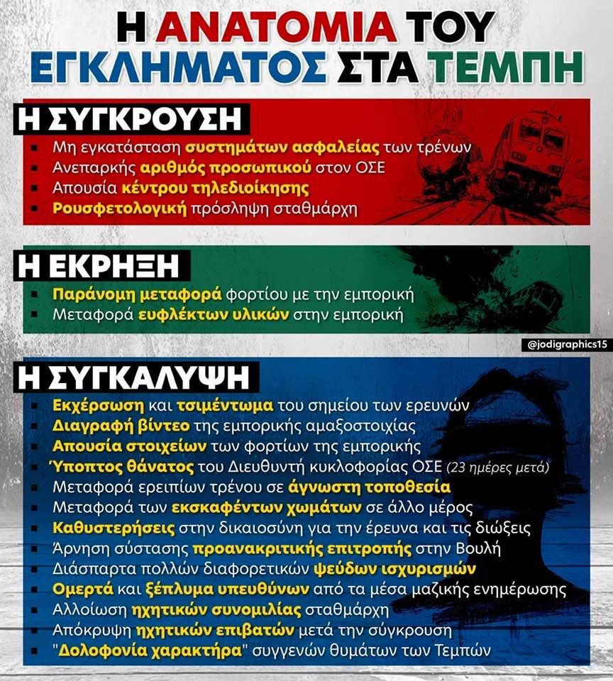 Η αφίσα του Jo Di για την ανατομία του εγκλήματος στα Τέμπη από τη σύγκρουση και την έκρηξη μέχρι τη συγκάλυψη: