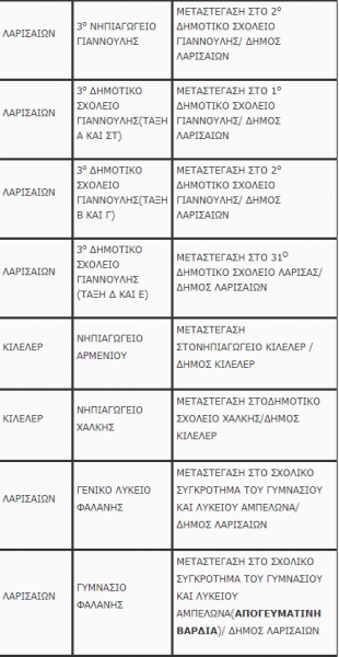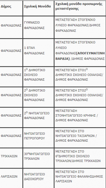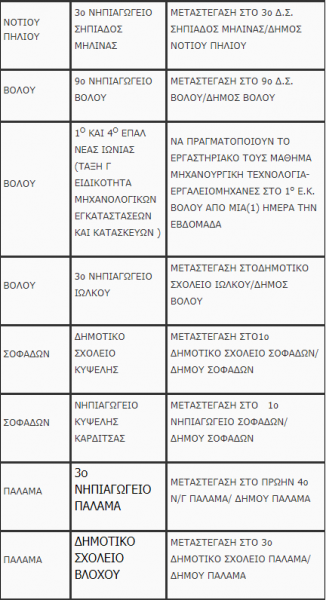Α. Θα μεταστεγαστούν προσωρινά σε κτίρια σχολικών μονάδων στον ίδιο ή σε όμορους δήμους και σε πρωινή βάρδια (εκτός δύο περιπτώσεων όπου ρητώς αναφέρεται απογευματινή βάρδια) οι παρακάτω σχολικές μονάδες ή τάξεις σχολικών μονάδων: