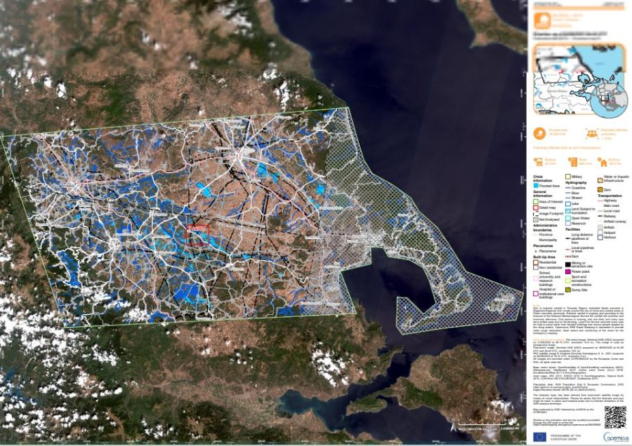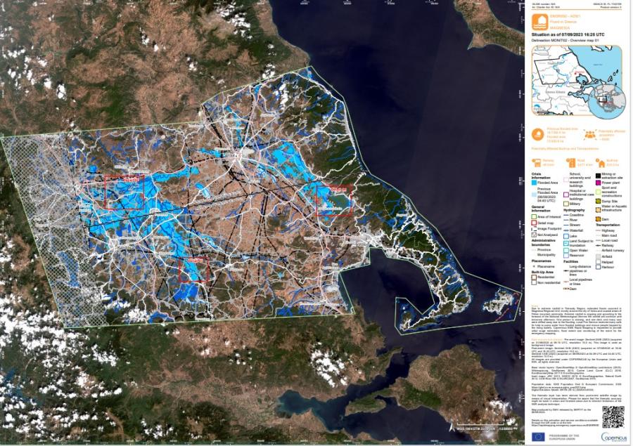 Σύμφωνα με ευρωπαϊκή υπηρεσία Copernicus, στη δορυφορική εικόνα, που ανέλυσε φαίνεται ότι η έκταση που πλημμύρισε από την κακοκαιρία Daniel «εξακολουθεί να πλήττεται σε μεγάλο βαθμό από τις πλημμύρες που προκλήθηκαν από την υπερχείλιση του ποταμού Πηνειού».