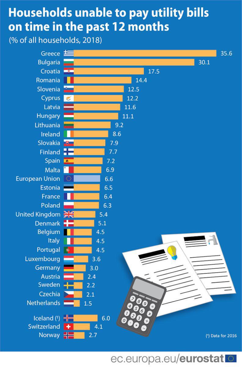 Για το 2018, η χώρα μας βρέθηκε στη χειρότερη θέση της ΕΕ με 35,6% των νοικοκυριών να μην μπορούν να ανταποκριθούν εγκαίρως στις υποχρεώσεις τους για τους λογαριασμούς ΔΕΚΟ, με τις Βουλγαρία (30,5%) και Κροατία (17,1%) να ακολουθούν. Στο αντίποδα της λίστας, τη μικρότερη δυσκολία αντιμετωπίζουν οι κάτοικοι της Ολλανδίας (1,5%), Τσεχίας (2,1%) και Σουηδίας (2,2%), ενώ ο μέσος όρος της Ευρωπαϊκής Ένωσης βρίσκεται στο 6,6%.