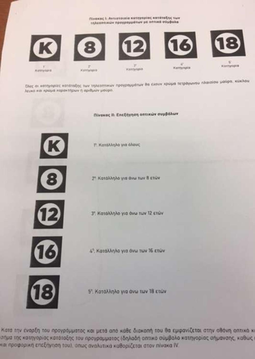 Τα νέα εμβλήματα που θα σηματοδοτούν την καταλληλότητα των προγραμμάτων της τηλεόρασης για ανηλίκους δημοσίευσε το υπουργείο Ψηφιακής πολιτικής, Τηλεπικοινωνιών και Ενημέρωσης. Τα νέα σήματα που αφορούν άτομα ηλικίας 8, 12, 16 και 18 ετών θα είναι τετράγωνα και θα δείχνουν έναν αριθμό στο κέντρο τους που είναι την ηλικία πάνω από την οποία μπορεί να δει το συγκεκριμένο πρόγραμμα κάποιος. Τα κανάλια είναι υποχρεωμένα να συμμορφωθούν από την 30η Σεπτεμβρίου 2019.