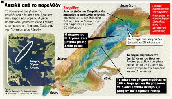 «Είναι μία μεγάλη ζώνη, που δίνει και πολύ ισχυρούς σεισμούς, οι περισσότεροι επιφανειακοί και στον θαλάσσιο χώρο. Περνάει νότια από τη Θάσο και τη Σαμοθράκη, βόρεια από τη Λήμνο, νότια από τις ακτές του Αγίου Όρους και φτάνει μέχρι τις Βόρειες Σποράδες […] είναι μία μεγάλη ρηξιγενής ζώνη, που αν δει κανείς τον χάρτη του πυθμένα στο Βόρειο Αιγαίο, χωρίς να είναι σεισμολόγος, θα μπορέσει σχετικά εύκολα να αναγνωρίσει το ρήγμα» δήλωνε τότε από την πλευρά του ο καθηγητής Γεωφυσικής του ΑΠΘ, Κώστας Παπαζάχος.