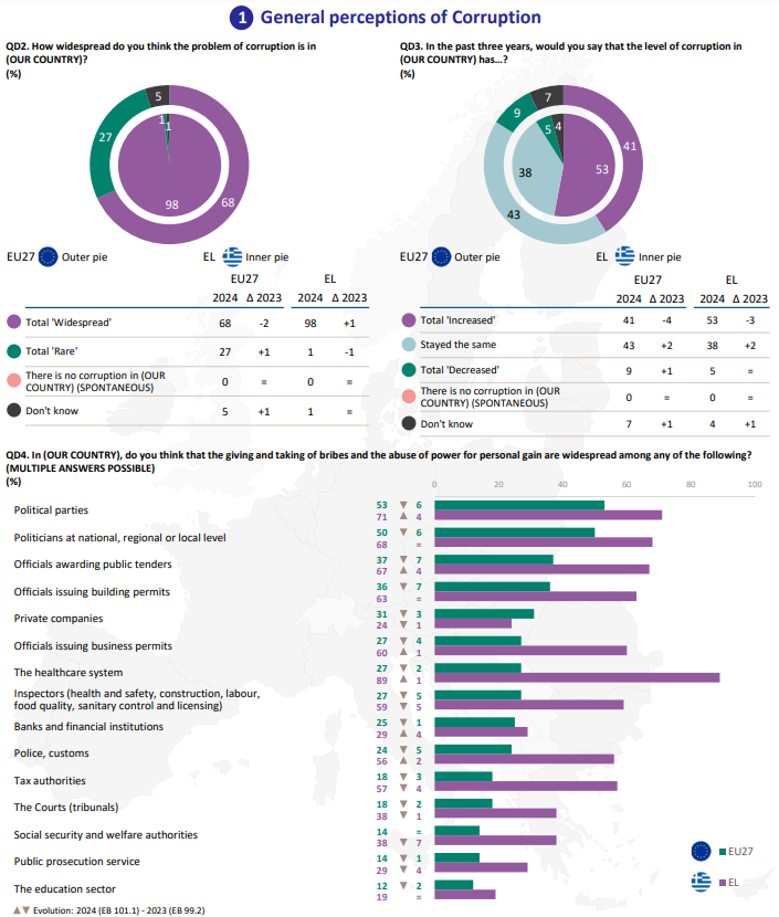 Το 53% στην Ελλάδα πιστεύει ότι η διαφθορά έχει αυξηθεί, το 38% ότι η κατάσταση έχει παραμείνει το ίδιο, ενώ μόλις το 5% θεωρεί ότι η κατάσταση έχει καλυτερεύσει.