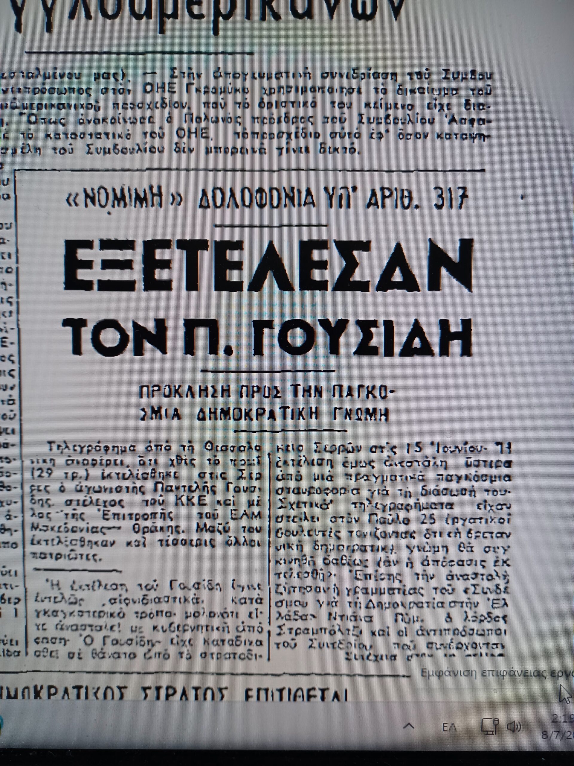 Αίσθηση στην κοινή γνώμη της Βόρειας Ελλάδας προκαλεί η εκτέλεση, στις 29 Ιουλίου 1947 στον συνήθη τόπο εκτελέσεων των Σερρών πέντε γνωστών Σερραίων, μεταξύ των οποίων ήταν ένα πολύ γνωστό στέλεχος, ο Γραμματέας της Επιτροπής Πόλης Σερρών του ΚΚΕ, Παντελής Γουσίδης, που ήταν ταυτ’οχρονα και γραμματέας του ΕΑΜ Μακεδονίας. Μαζί του στήθηκαν στο εκτελεστικό απόσπασμα και τουφεκίστηκαν και οι Κώστας Πακίνης από την Κορμίστα, Λ. Μαστορίδης από την Νιγρίτα, Τριαντάφυλλος Σαραντίδης και Δημήτρης Μίτσογλου από τα Σέρρας. Ο Γουσίδης κατηγορήθηκε ότι λειτουργούσε ως…. «σύνδεσμος των Ελλήνων συμμοριτών μετά των Βουλγάρων κομμουνιστών», γιαυτό και οι κατευθυνόμενες τοπικές εφημερίδες έσπευσαν τις επόμενες μέρες να γράψουν ότι «η κοινή γνώμη της πόλεώς μας ησθάνθη σήμερον πλήρη ικανοποίησιν εκ της επιβολής του νόμου εις τους αντεθνικώς εργαζομένους σλαβόφιλους».