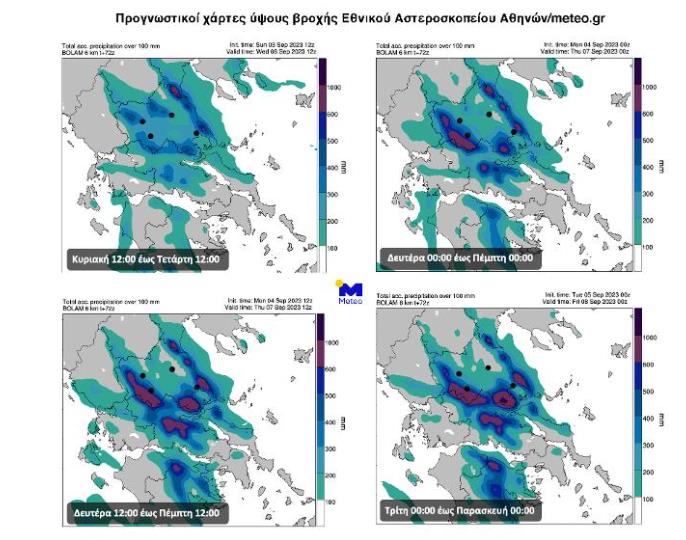 Οι χάρτες που παρουσιάζονται δείχνουν το συνολικό προβλεπόμενο ύψος βροχής σε χιλιοστά με χρονικό ορίζοντα 72 ωρών από τις 4 αρχικοποιήσεις του αριθμητικού μοντέλου πρόγνωσης καιρού του Εθνικού Αστεροσκοπείου Αθηνών/meteo.gr μεταξύ Κυριακής 3 και Τρίτης 5 Σεπτεμβρίου 2023.