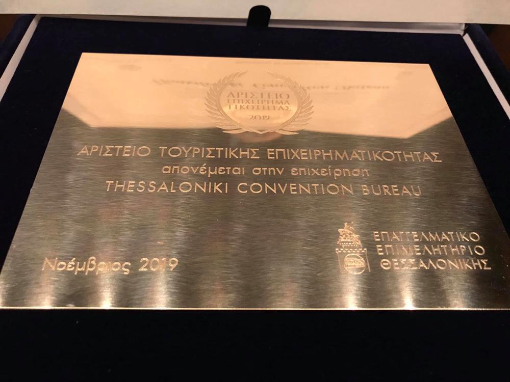 Με αριστείο επιχειρηματικότητας βραβεύτηκε το Thessaloniki Convention Bureau στο πλαίσιο της τελετής απονομής των πρώτων Αριστείων Επιχειρηματικότητας του Επαγγελματικού Επιμελητηρίου Θεσσαλονίκης που έλαβε χώρα με μεγάλη επιτυχία τη Δευτέρα 25 Νοεμβρίου 2019 στο Βασιλικό Θέατρο. Σκοπός της συγκεκριμένης εκδήλωσης ήταν να τιμηθούν τα μέλη του Επαγγελματικού Επιμελητηρίου για τα επιτεύγματά τους στην επιχειρηματική τους δραστηριότητα.