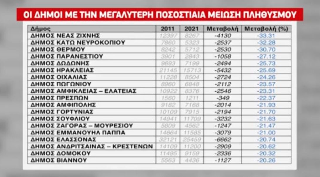 Οι 19 δήμοι με την μεγαλύτερη μείωση πληθυσμού Στο γράφημα που ακολουθεί καταγράφονται οι 19 δήμοι με την μεγαλύτερη ποσοστιαία μείωση πληθυσμού: