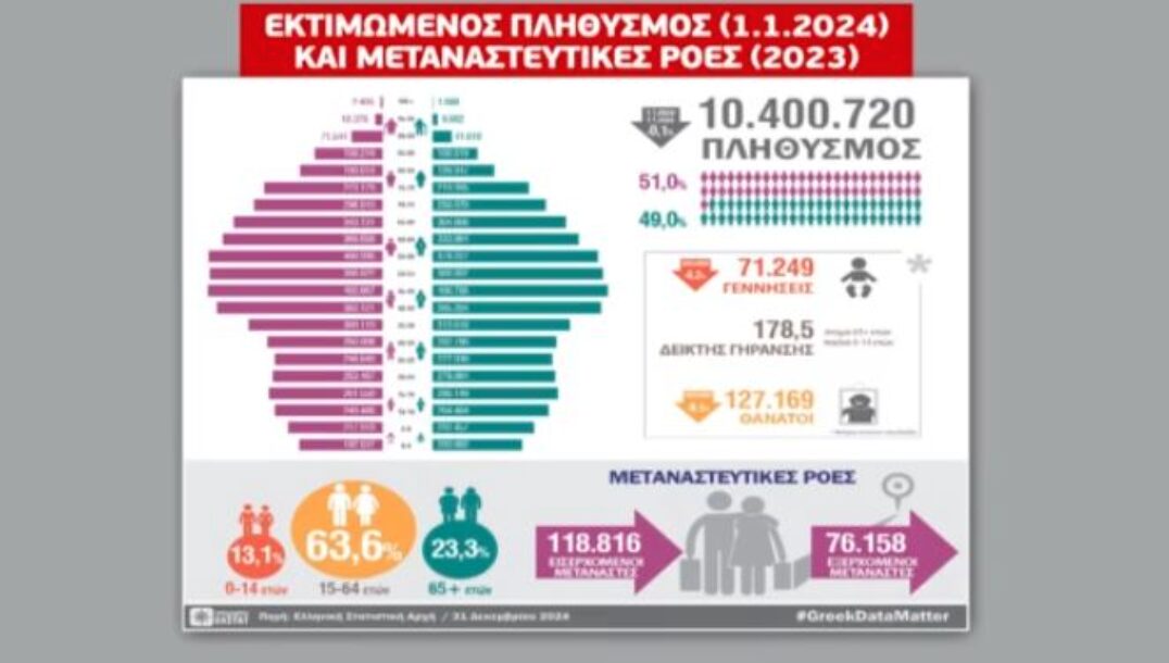 Εκτιμώμενος πληθυσμός (1/1/24) και μεταναστευτικές ροές (2023)